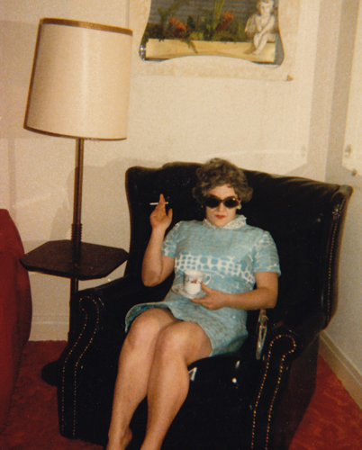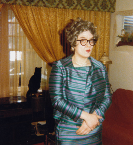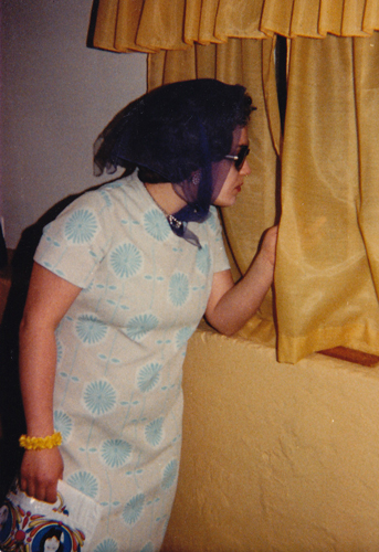 Aunt Viv looks out the basement window while carrying a Partridge Family plastic bag. The stuff we used to find at thrift stores!