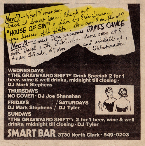 Ad from Chicago Reader when HOUSE OF SIN played at the Smart Bar. We had basically nobody show up, but we set up a screen on the dance floor.
