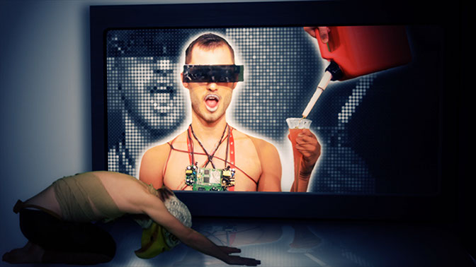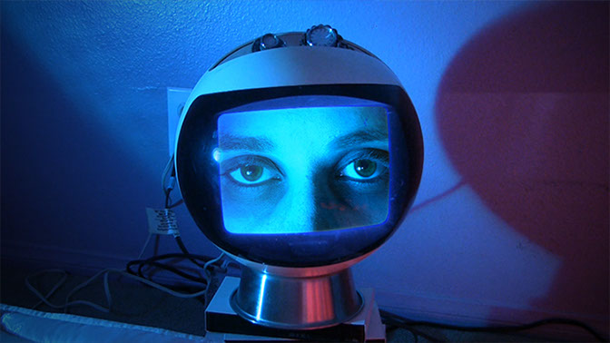 I superimposed the closeup of his eyes onto our round tv... please note, the stand is a metal dog dish on a stack of VHS tapes!