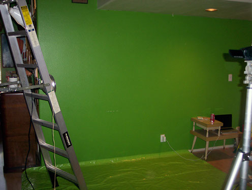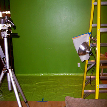 Our green screen setup... a green painted wall, a green plastic tablecloth on the floor, two ladders holding clip-on lights with tracing paper filters, and my little HD camera on the tripod I have been using since the 80s!