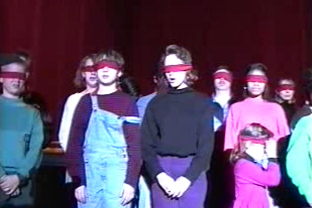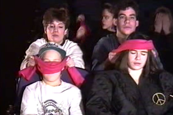 Blindfolds on for a shot of all the kids in the audience to symbolize parents trying to hide the truth from their children.