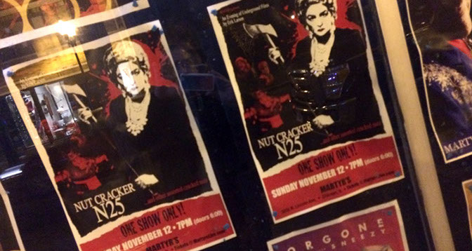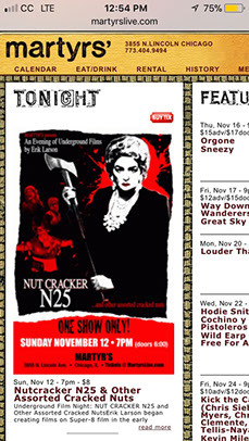 Tony I were traveling over the holidays in 2015, so I was not able to have an appropriate screening of NUT CRACKER N25. Jerry Nunn had a house party screening, but beyond that it only turned up online. As we got into 2017, Uncle Alice approached me about doing a screening at Martyr’s in Chicago. I liked the idea; we hadn’t done a screening in a long time, and Martyr’s is a terrific location. Of course me being me, I didn’t want to simply pop into town and show a 25 minute video. If our friends, family and fans (I hate using that word, but there are people who seem to like our work so I’ll call them that for lack of a better term) were going to gather, I wanted to give them a show. So I set about putting together a career-spanning retrospect of all of our projects to date. I wanted to present it like an old 50’s instructional film, so I decided to title the evening WHAT IS UNDERGROUND FILM?